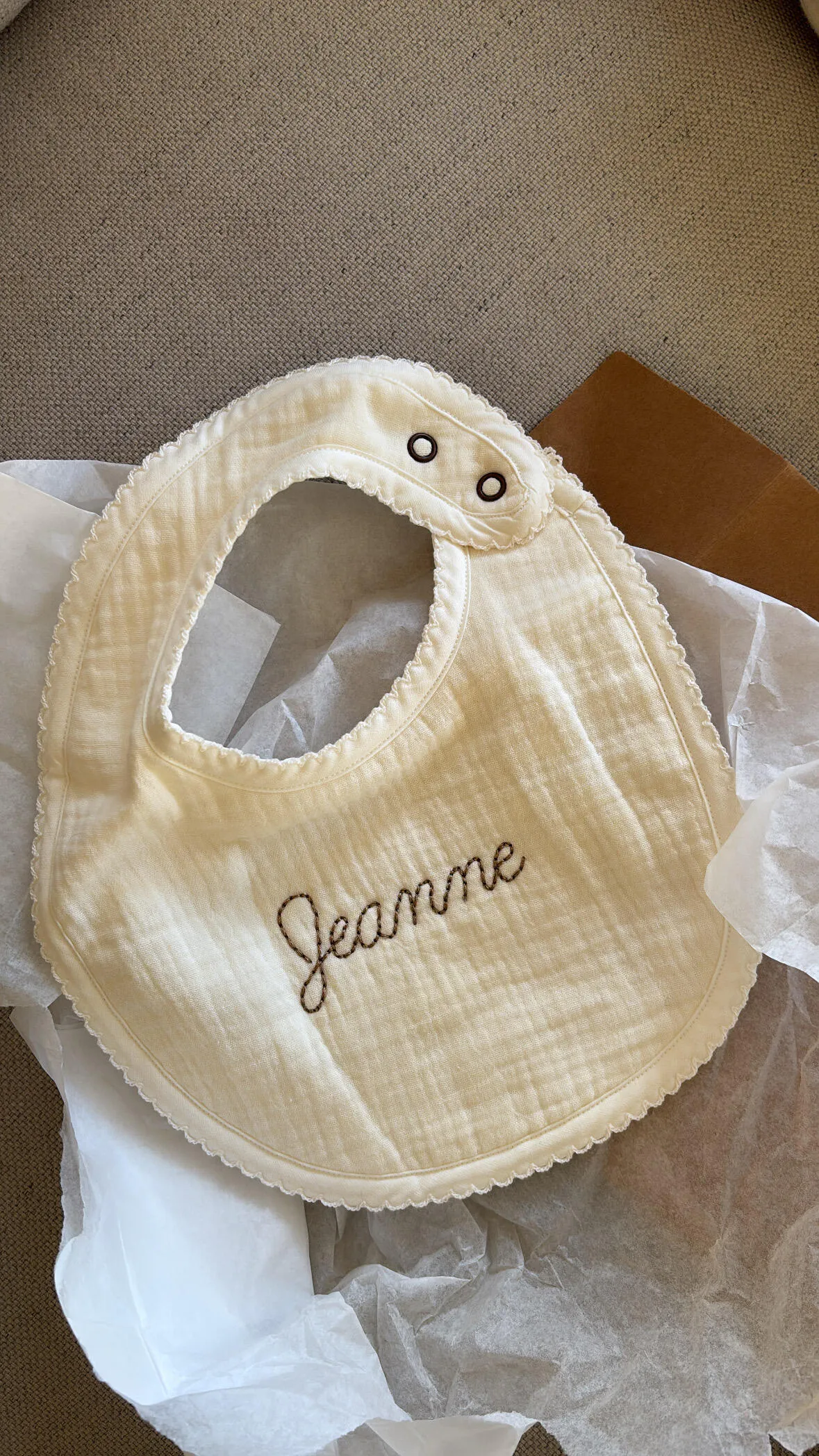 Petit bavoir acheté en écru pour l’arrivée de notre petite fille, nous avons choisi la broderie en couleur laiton qui est très jolie !